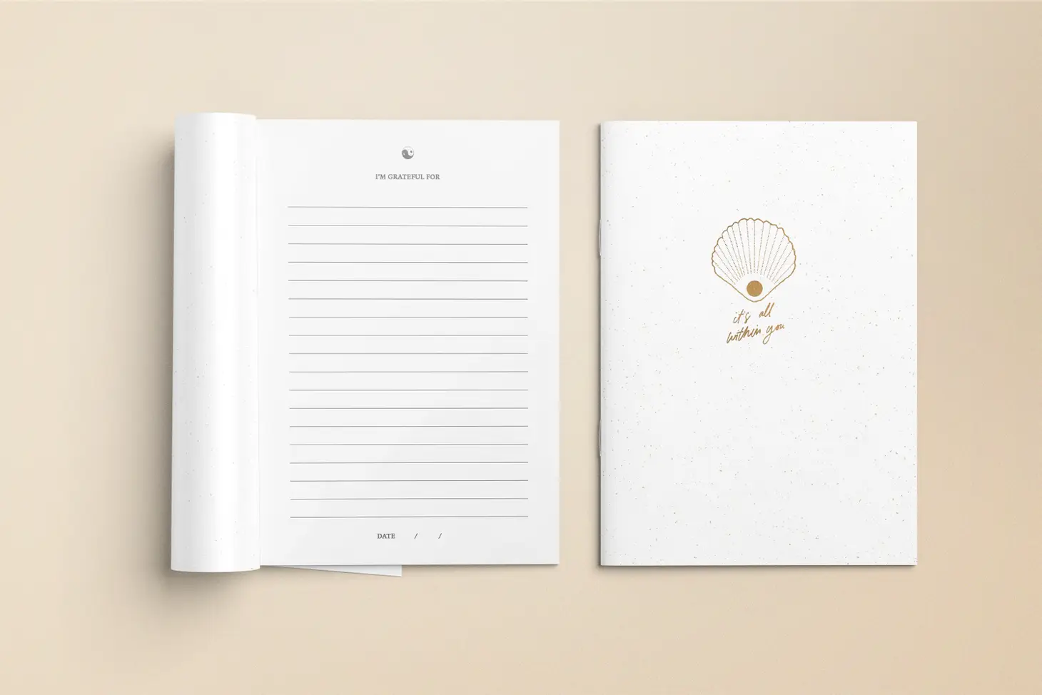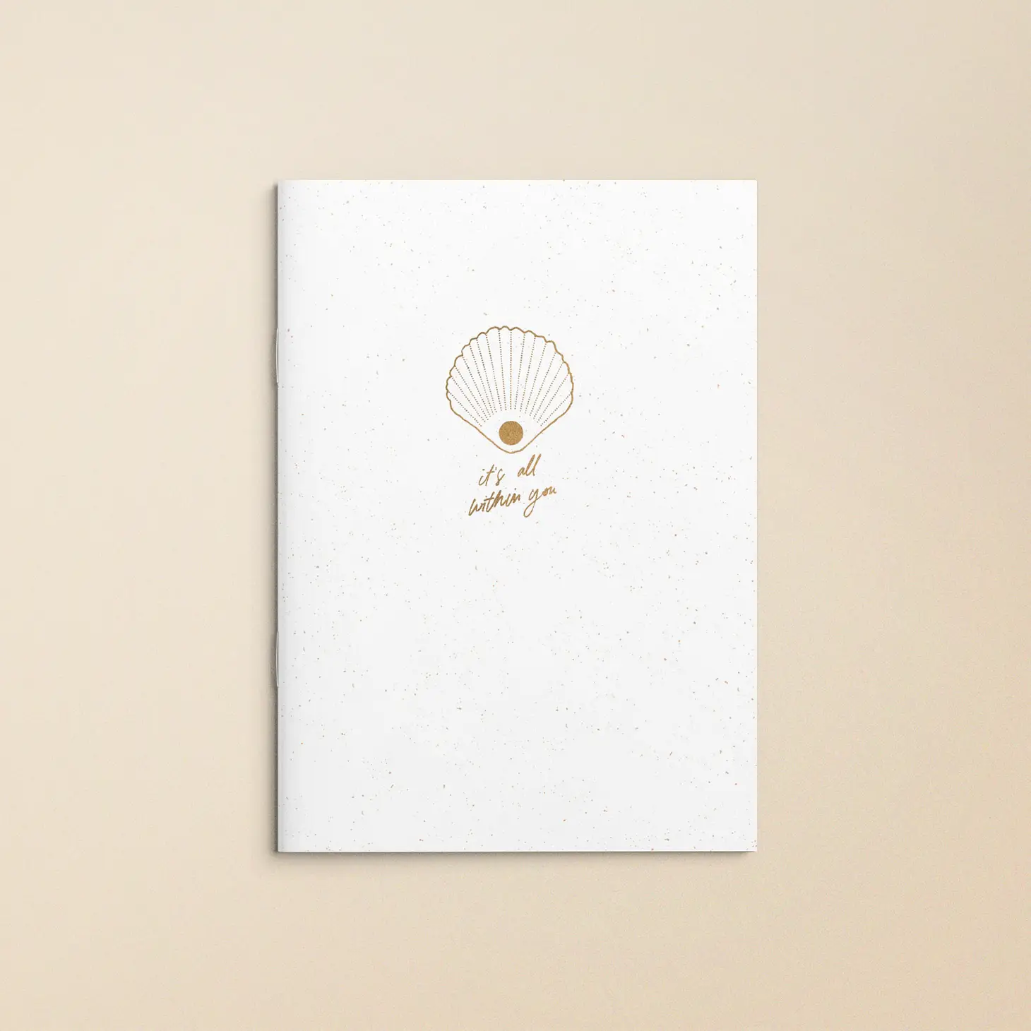 Der Umschlag ist handbedruckt mit Goldfolie. Die Hülle besteht aus ungestrichenem Papier in cremefarbenem Lack, durch das schöne recycelte Fasern schimmern. Die Seiten auf der Innenseite bestehen zu 100% aus Recyclingpapier.