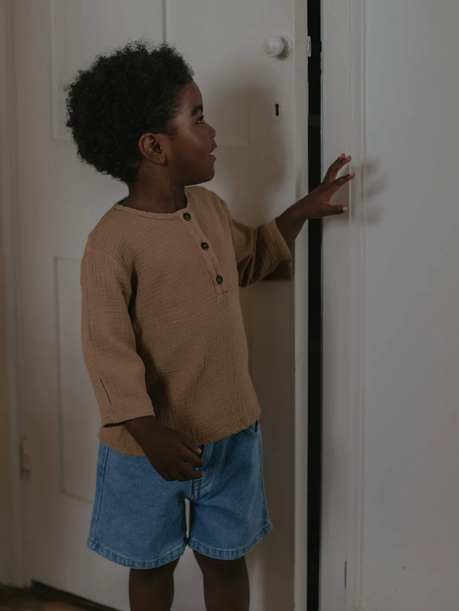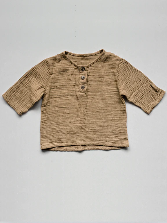 Dieses wunderschöne Musselin Kinderhemd mit 3/4 Ärmeln ist aus unglaublich weichem und luftigem Baumwoll-Musselin gefertigt und hat Kokosnussknöpfe auf der Vorderseite. Dieses stilvolle Oberteil ist sorgfältig in einer bequemen, entspannten Passform und einer sanften Farbpalette gefertigt.