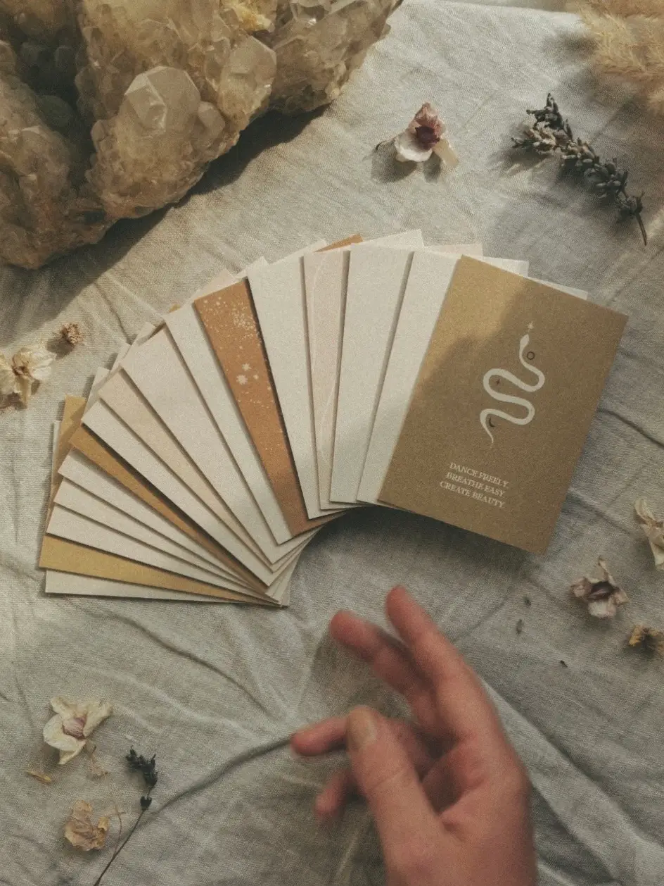 A card set with 16 affirmation cards in DIN A7 format (7.4 x 10.5 cm). Finn cardboard is made of high-quality uncoated paper and is approx. 0.2 mm thick. The cardboard can show small unevenness due to the paper fibers.