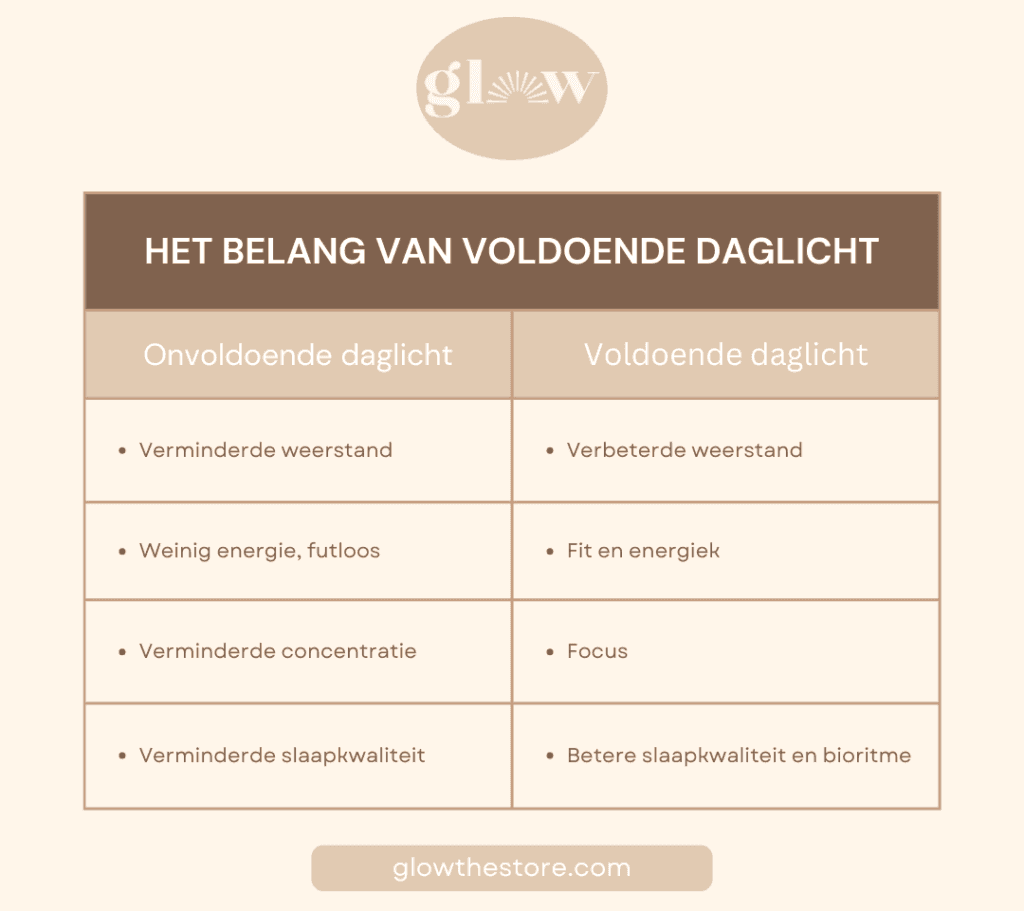 Onder invloed van daglicht maakt je lichaam vitamine D aan. Deze is nodig om calcium uit je voeding op te kunnen nemen. Vitamine D is belangrijk voor de groei en het zorgt voor een behoud van stevige botten en tanden. Daarnaast speelt vitamine D ook een rol bij een goede werking van de spieren en is het bevorderlijk voor je weerstand. Er zijn ook steeds meer aanwijzingen voor een verband tussen je stemming en vitamine D. Mensen die voldoende vitamine D aanmaken hebben minder vaak last van depressieve klachten dan mensen met een vitamine D tekort.