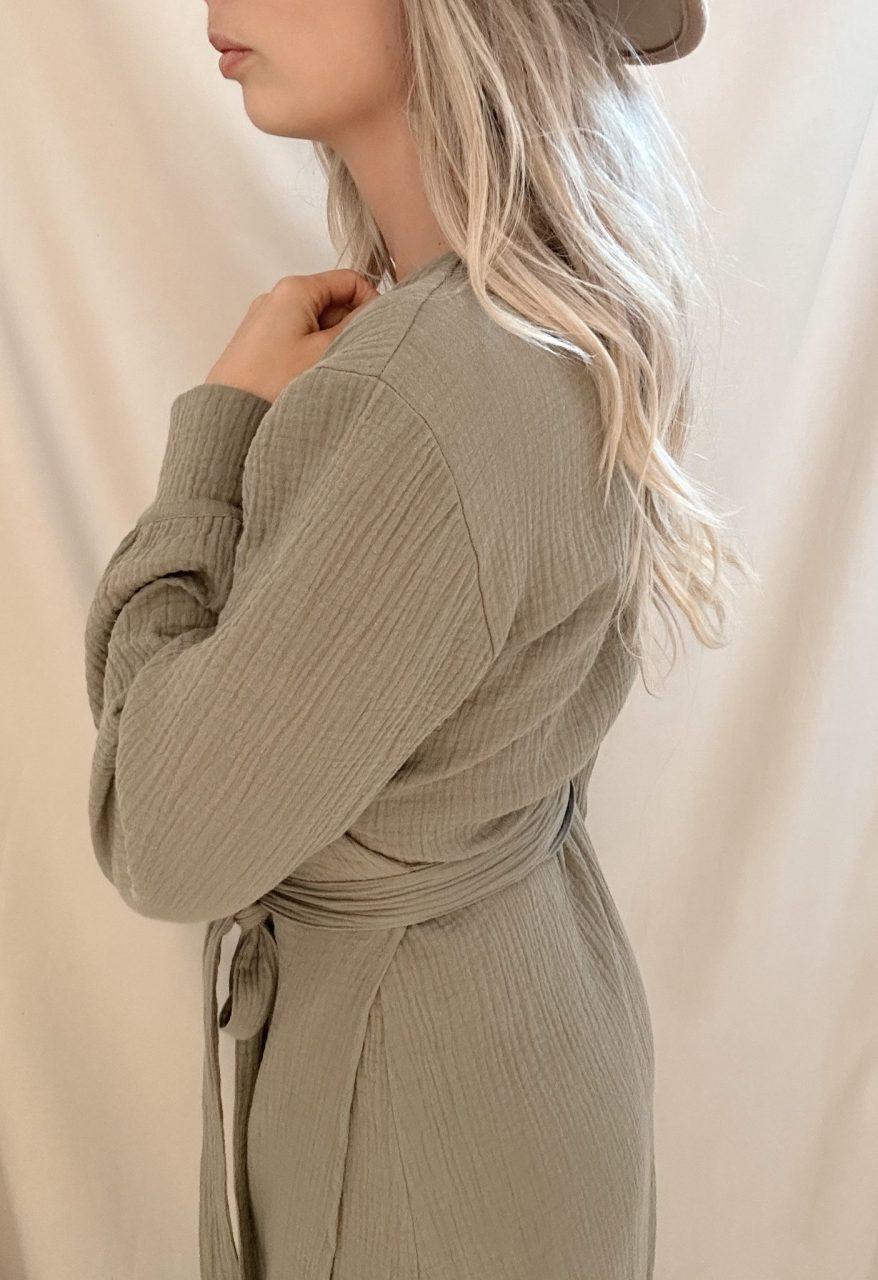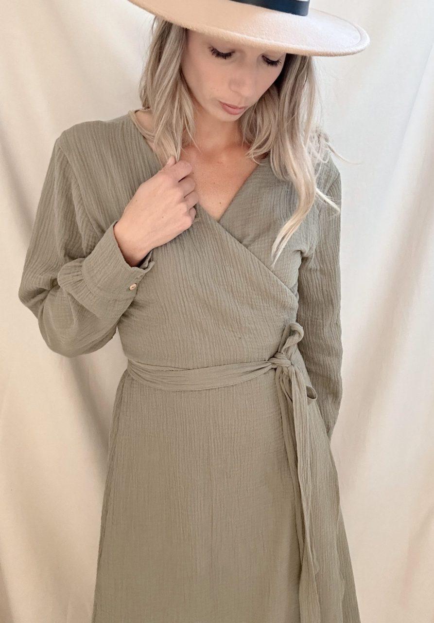 Deze prachtige duurzame jurk is gemaakt van een heerlijk zachte mousseline stof. Deze stijlvolle overslagjurk heeft een strikceintuur die je op verschillende manieren kunt knopen. Deze duurzame jurk heeft knopen aan de mouwen, waardoor je de mouwen ook op kunt rollen. Een fijne veelzijdige jurk dus, die je in de winter kan dragen met een lekker vest of trui en een paar laarzen en in de zomer met opgerolde mouwen en slippers 🙂 Ook heel geschikt voor mommy’s to be!