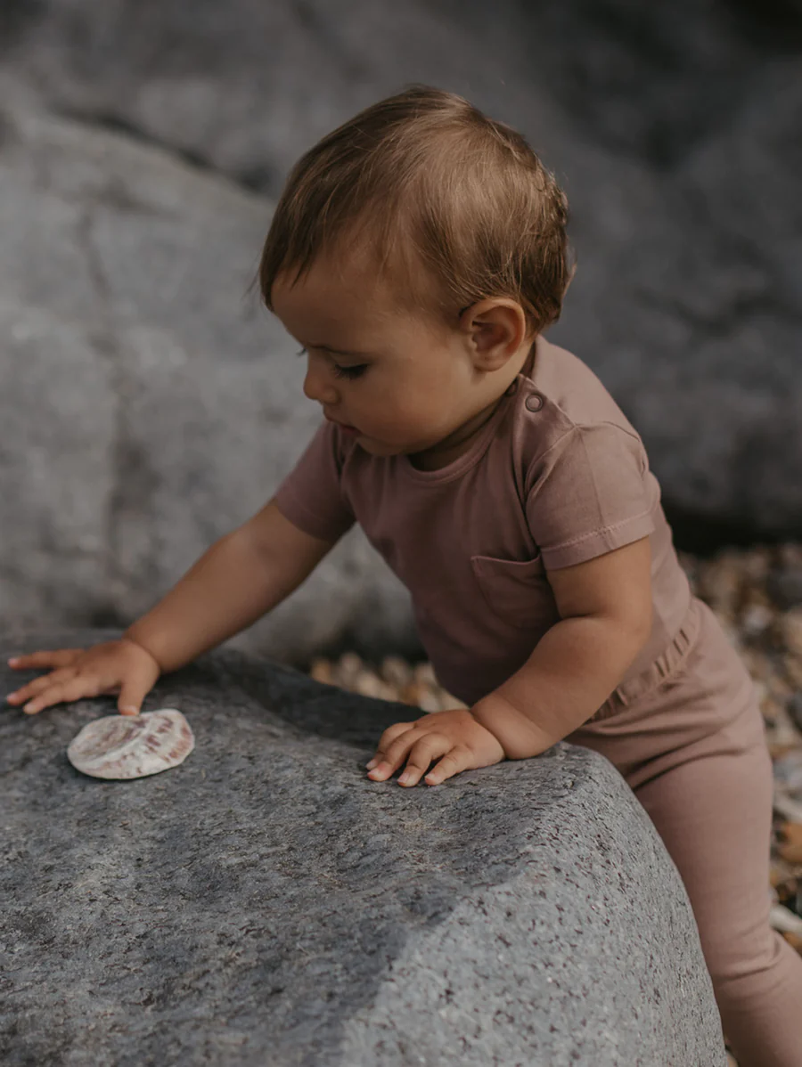 Deze prachtige baby romper is gemaakt met behulp van aarden pigmenten afkomstig van fruitresten en notendoppen, de Plant Dyed Collection van The Simple Folk is zacht, niet-toxisch en eert het milieu.